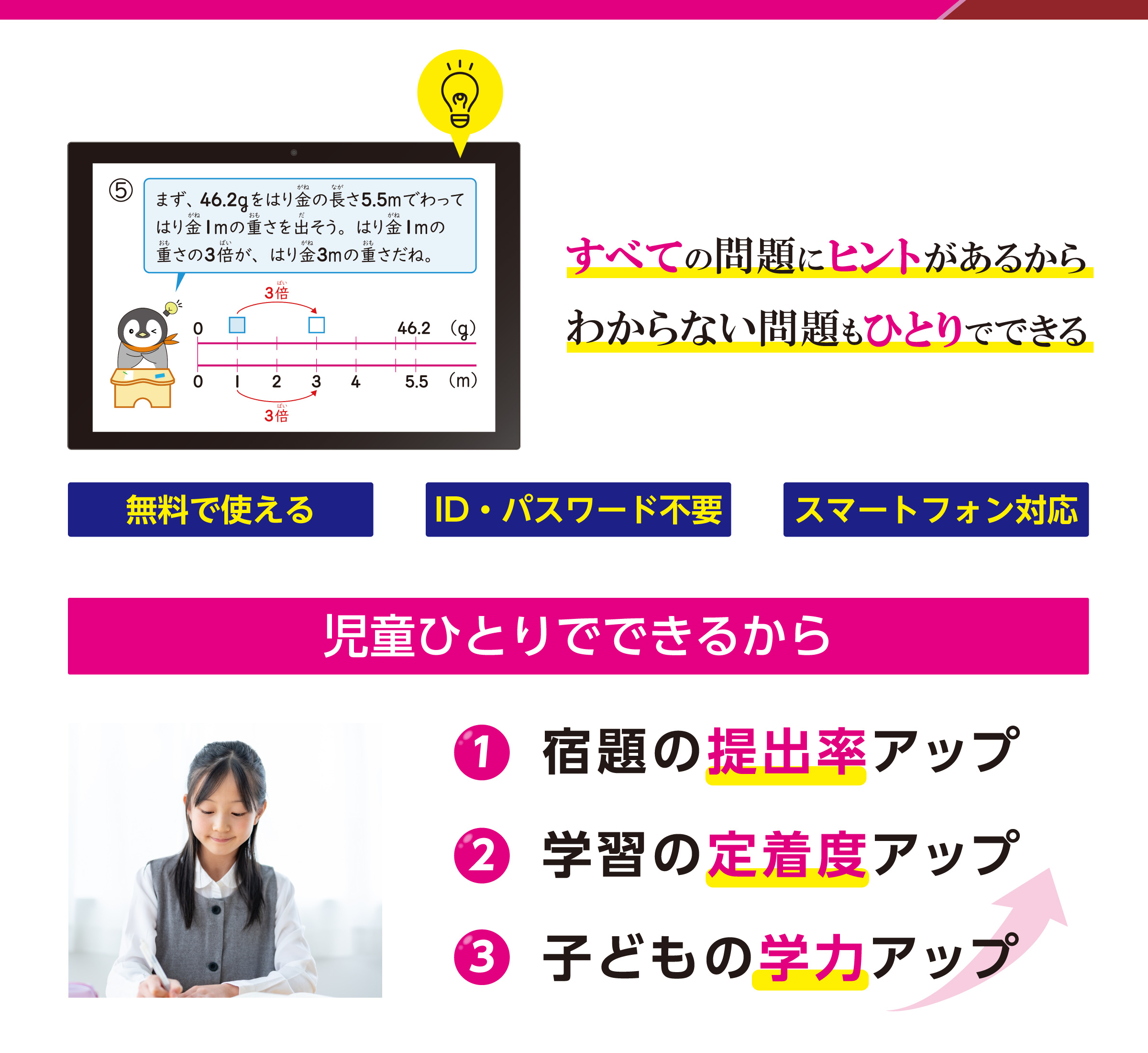 表紙のQRコードをスマートフォンやタブレットで読み取ると、デジタルブックにアクセスでき、ドリルの問題のヒントが見られます。答えは表示されません。